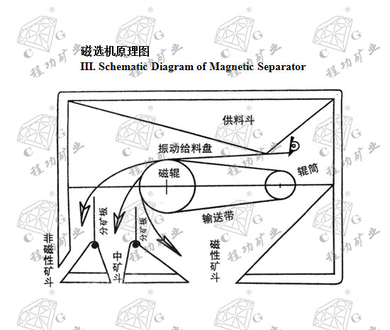矿料由料斗落入振动给料盘均匀散落的在输料带上,再由输料运送到磁辊上磁选。由于磁性矿物和非磁性矿物经过磁辊时受磁感应力的不同,而落入两个不同的接矿槽中,从而达到矿物分选目的。